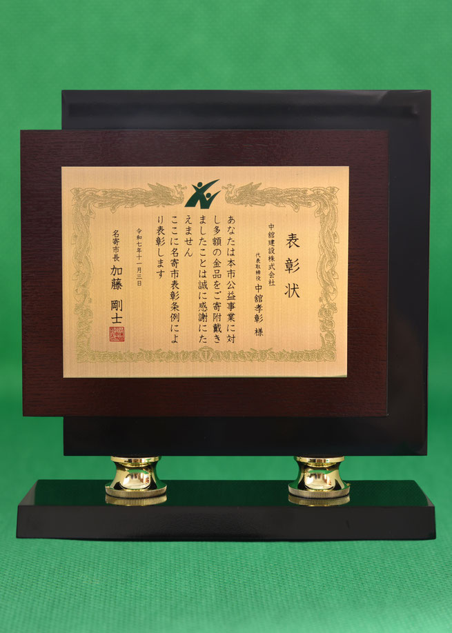 中舘建設株式会社(本社 北海道名寄市風連町大町54、代表取締役 中舘孝彰)は、名寄市より令和 7年度の善行表彰の決定を受け、去る11月3日の名寄市功労・善行・栄誉賞表彰式において表彰状を拝受いたしました。